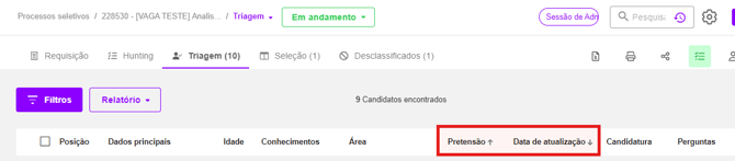 No entanto, tanto em Triagem quanto em Hunting, você pode personalizar a ordem de visualização. Basta passar o mouse sobre o título das colunas e aparecerá uma seta para que você possa determinar a ordem desejada. Você pode ordenar por ordem alfabética, maior ou menor pretensão salarial, ou candidatura mais recente, ou mais antiga.