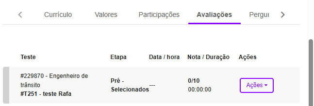 Acesse o card do candidato e clique na aba Avaliações. Você pode encontrar o candidato que tem um teste a responder ou respondido já do lado externo do card, através do ícone de caderno, como mostra abaixo.