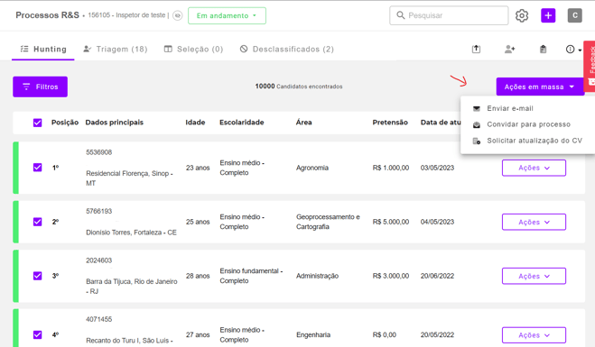 Em seguida, selecione todos os candidatos que você deseja contatar na caixinha de seleção acima dos nomes > clique no botão roxo “Ações em massa” no canto superior direito > Enviar e-mail.