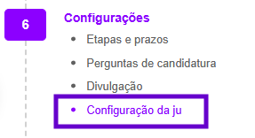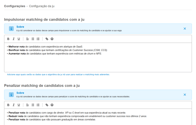 Ao criar um novo processo seletivo, você pode contar com a ajuda da Ju logo nas Configurações, dentro da seção “Configuração da Ju”: